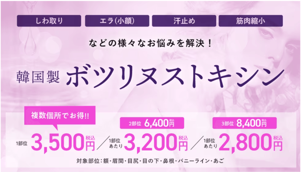 特に人気のボツリヌス・トキシンでは会員価格3,020円からの低価格で表情ジワ、エラの張り、多汗症、肩こり、ふくらはぎの改善ができます。