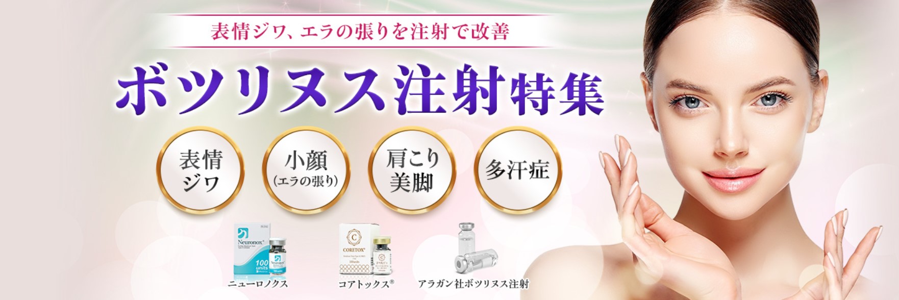 表情ジワや小顔、肩こり美脚、多汗症などを注射で改善することができます。